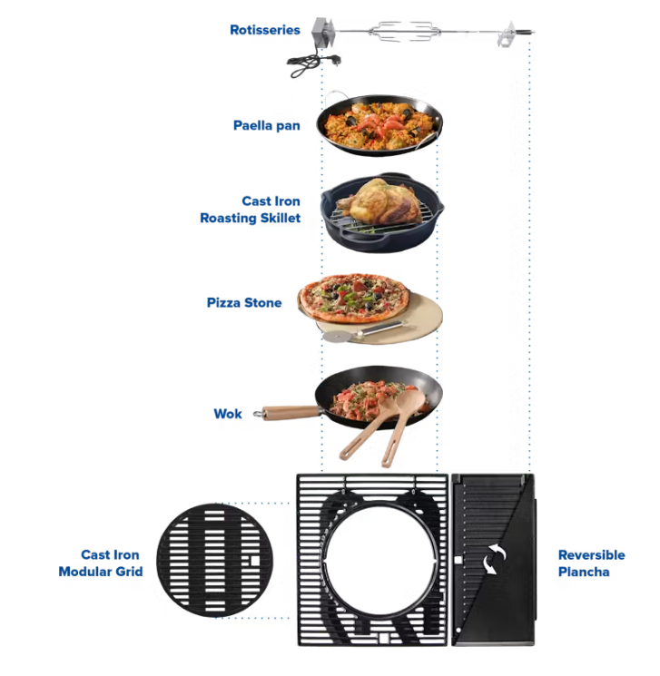 • Spolu s litinovou smaltovanou varnou plochou je tento gril ideální pro přípravu široké škály pokrmů pod širým nebem. Výkonný postranní hořák lze použít k přípravě příloh ke grilovanému jídlu a tak můžete připravit rozmanité kulinářské hody.