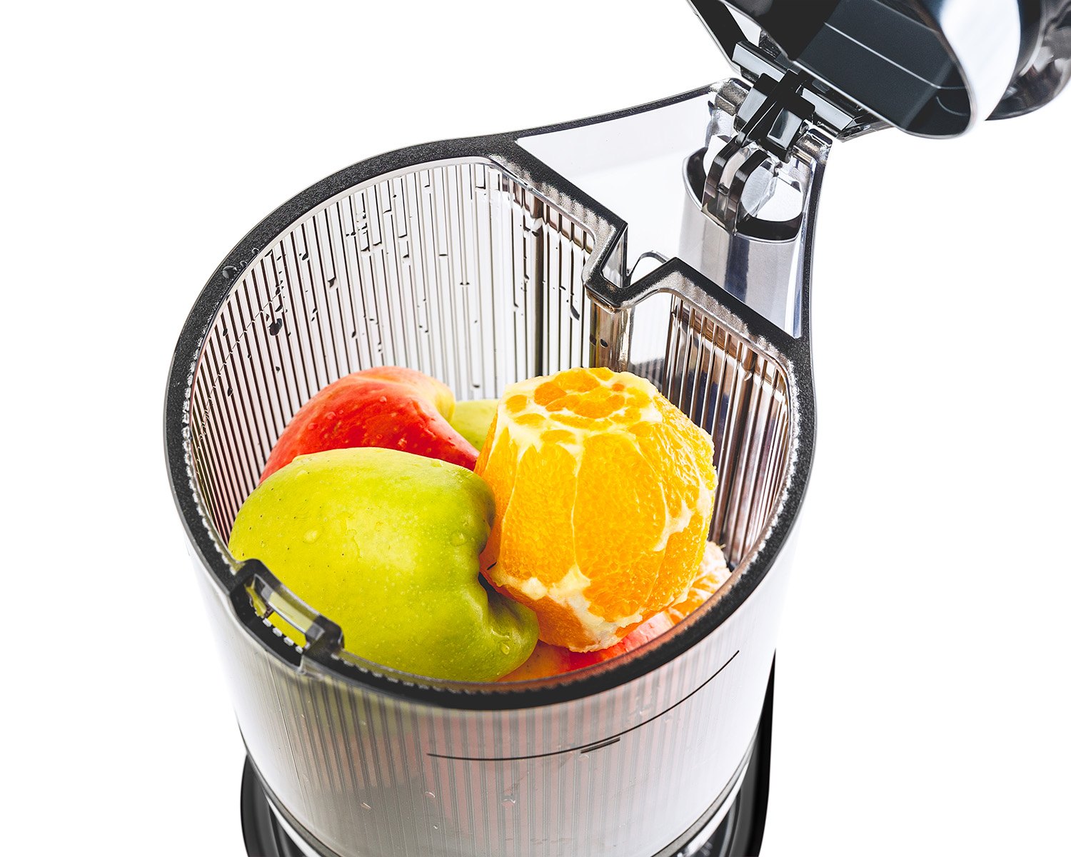 Do odšťavňovače nemusíte vhazovat a pěchovat každý kousek ovoce a zeleniny zvlášť. Naplňte předem automatickou násypku, zapněte odšťavňovač a mezitím připravujte něco jiného. Odšťavňovač si bude odebírat a zpracovávat suroviny sám. Násypka si poradí i s celými jablky, většími kusy mrkve a listovou zeleninou! Najednou pojme zhruba kilo surovin, což znamená až čtyři celá jablka.