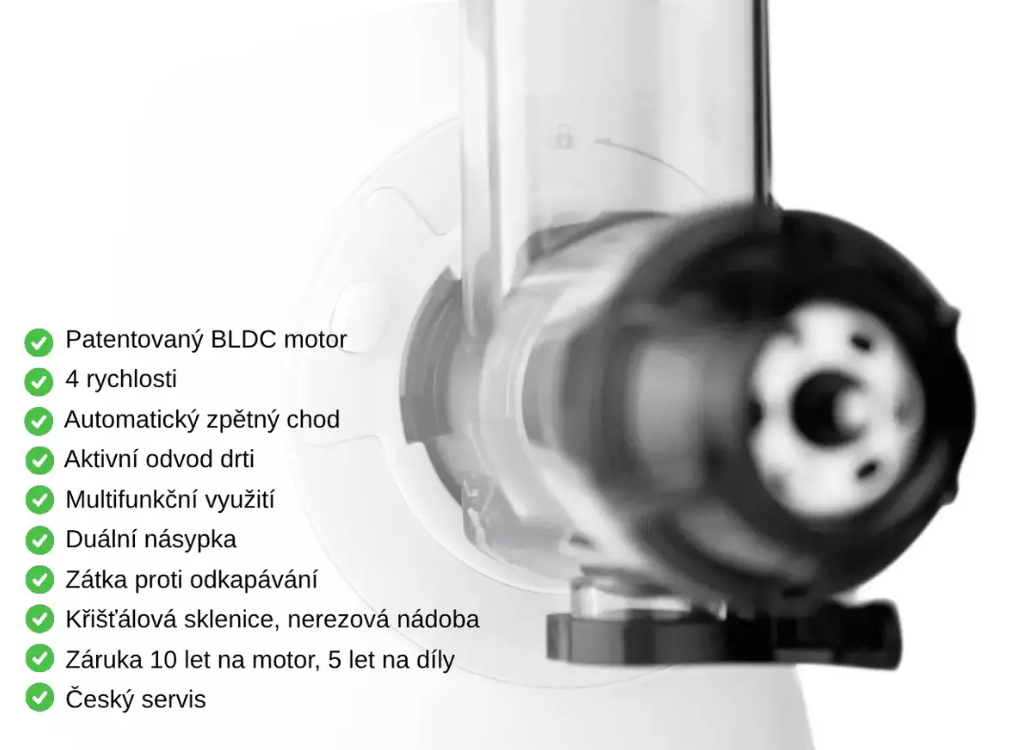 Nižší rychlost znamená šetrnější a dokonalejší vylisování, šťáva bude čistá, beze zbytků vlákniny a bez pěny. Zároveň dosáhnete nepatrně vyšší výtěžnosti.