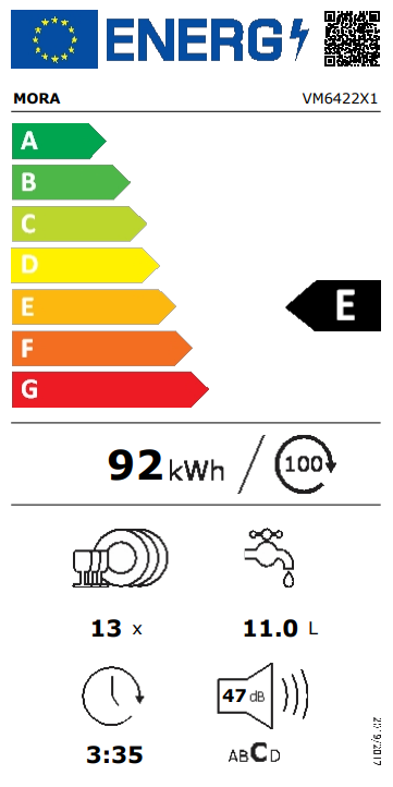 Vestavná myčka MORA VM 6422 X1 v energetické třídě E ve standardní šířce 60 cm má kapacitu 13 sad nádobí. Je vybavena dvěma koši a příborovým košíkem. Ovládací panel je opatřen dotykovým ovládáním s displejem. Praktická funkce RychléMytí umožňuje zkrátit délku vybraných programů. Samozřejmostí je úsporný ECO program nebo praktický odložený start, který umožňuje nastavení startu programu až do 24 hodin. Myčka má navíc praktický samočisticí filtr, který automaticky odstraní zbytky mastnoty a jídla ve filtru a zamezí nesprávnému chodu spotřebiče. Má také automatický program pro čištění celého vnitřku myčky včetně ramen a trysek. Se systémem AquaStop se nemusíte obávat nemilého překvapení v podobě vytopení.